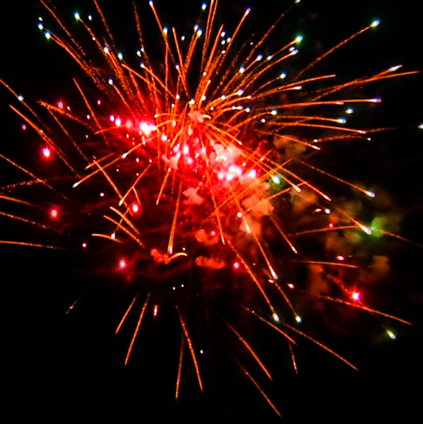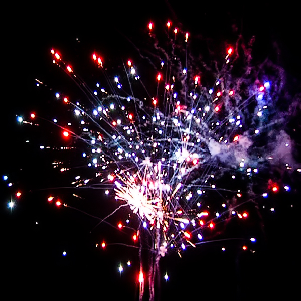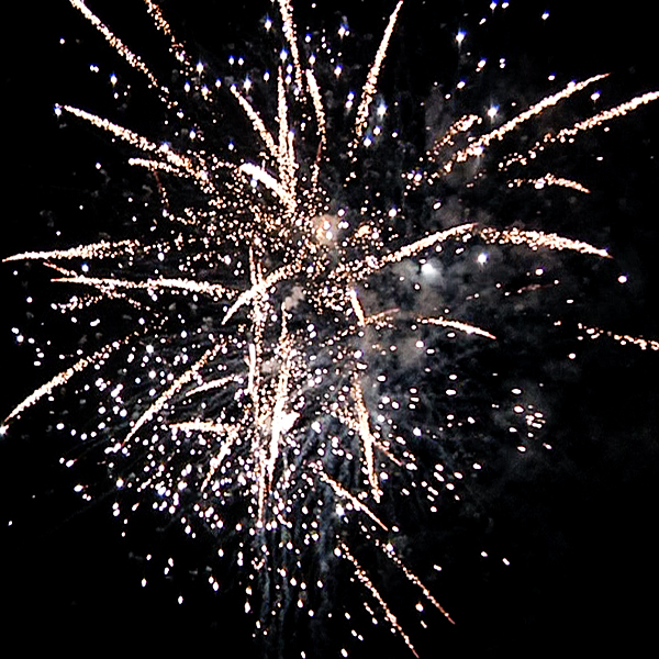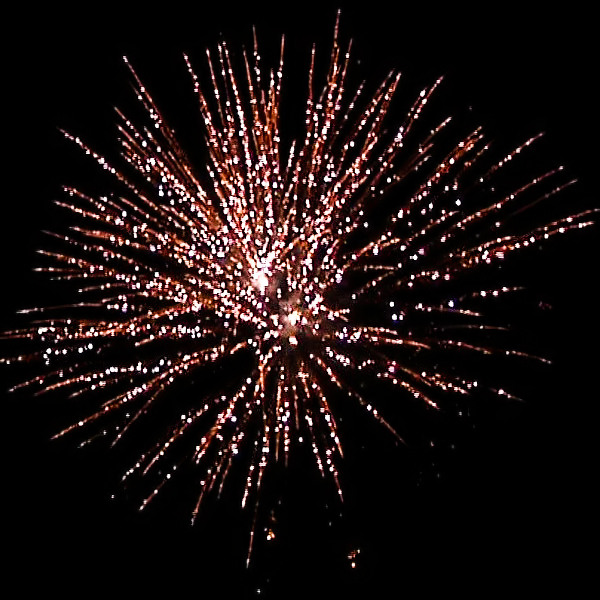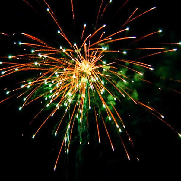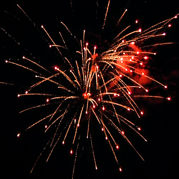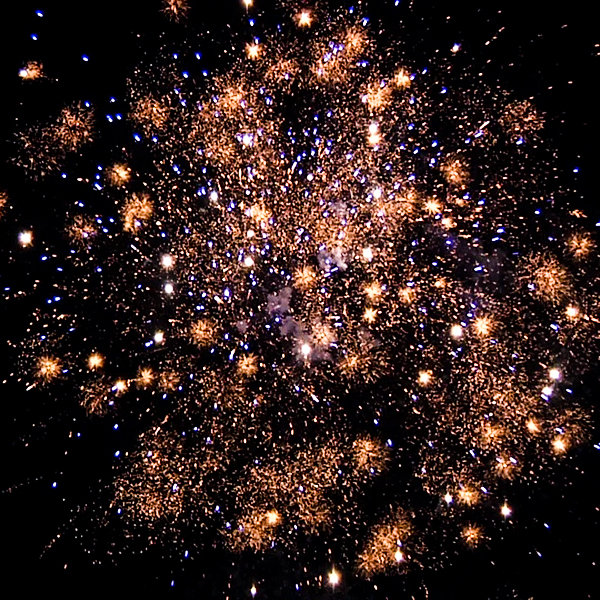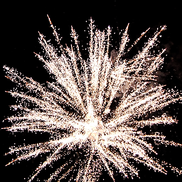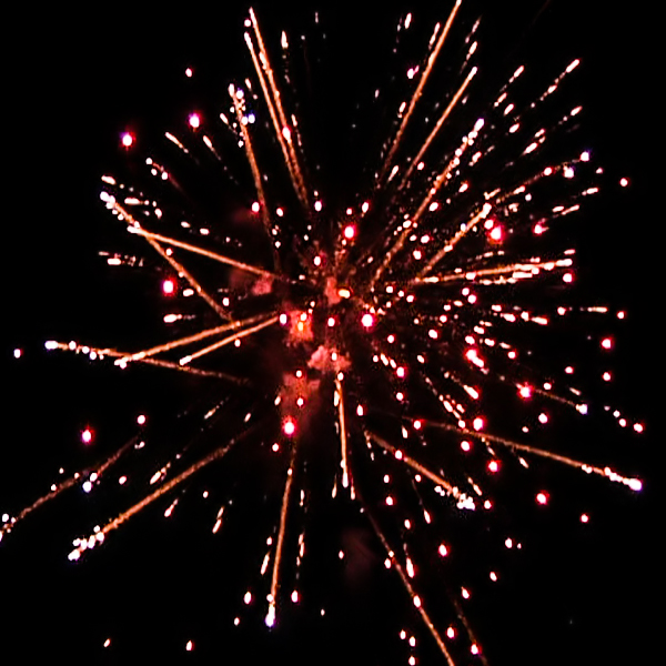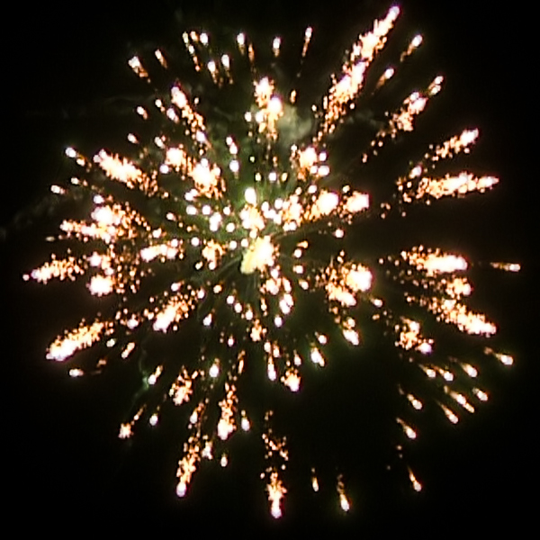 Золотая парча с синими жемчужинами; разноцветные мерцающие пионы; красные и зеленые хризантемы; золотые ивы в окружении красного мерцания; серебряные пальмы в алых звездах; серебряные кометы в красных сферах; золотые пауки в зеленом мерцании; небесно-голубые жемчужины и золотой треск; пальмы в серебряном или красном блеске; мерцающие золотые кометы. Финал - букет из трещащих пальм.