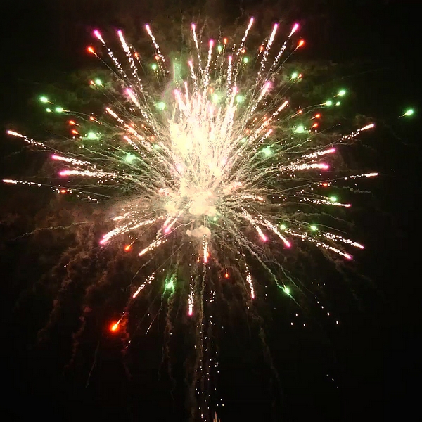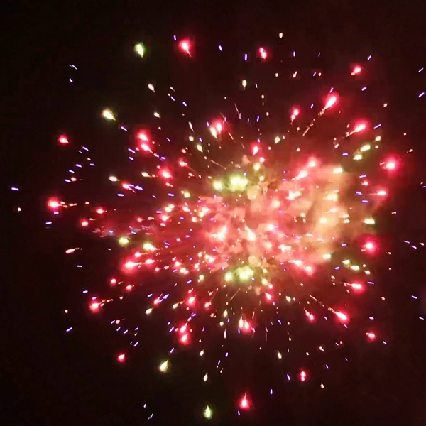 1. Красные мерцающие пионы; 2. Пурпурные мерцающие пионы; 3. Хризантема с треском; 4. Парча с треском; 5. Золотая пача; 6. Персиковые лепестки; 7. Мелкий треск; 8. Парча и красные звезды; 9. Парча и зеленые звезды; 10. Парча и пурпурные звезды; 11. Красные хризантемы с треском; 12. Свистящие змейки; 13. Пурпурные хризантемы с тресклм; 14. Трещащие шлейфы; 15. Золотое трещащее облако.
