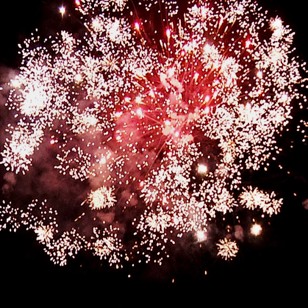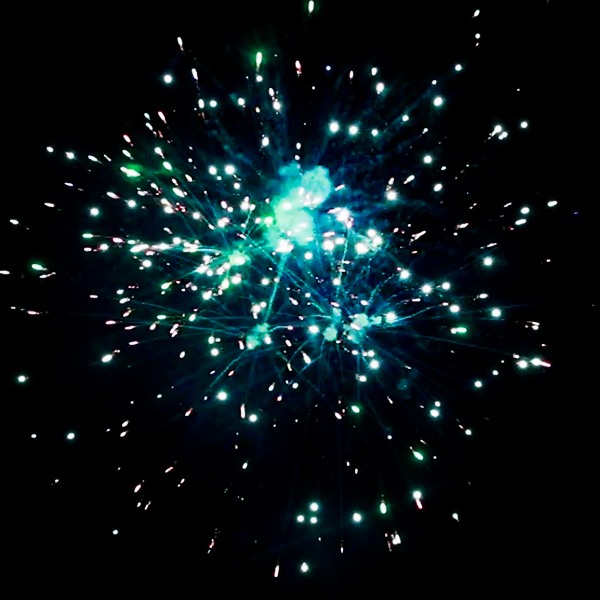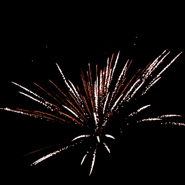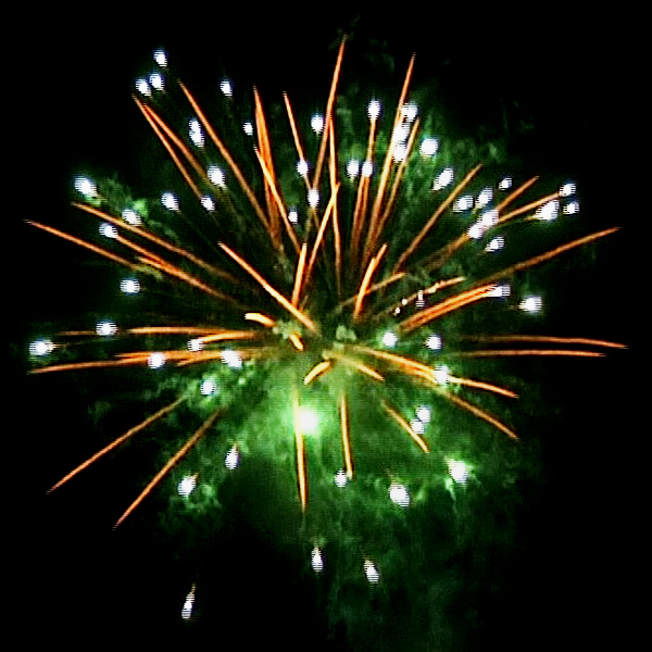 Золотые трещащие шлейфы раскрываются золотыми трещащими облаками; тысячи трещащих одуванчиков с разноцветными жемчужинами; трещащие хвосты переходят в разноцветные пионы; красные хризантемы с треском. Финал - золотая парча.